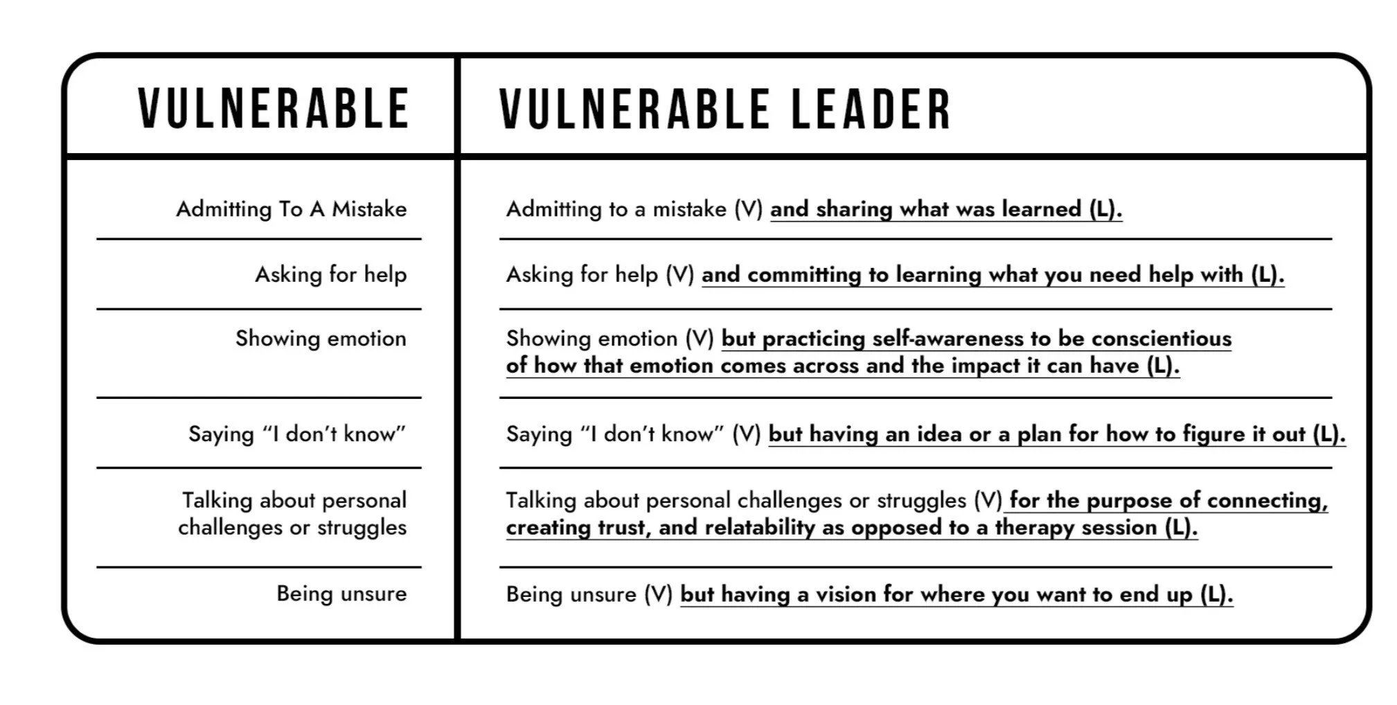 I am attaching the framework with a few more examples of being vulnerable versus being a vulnerable leader.